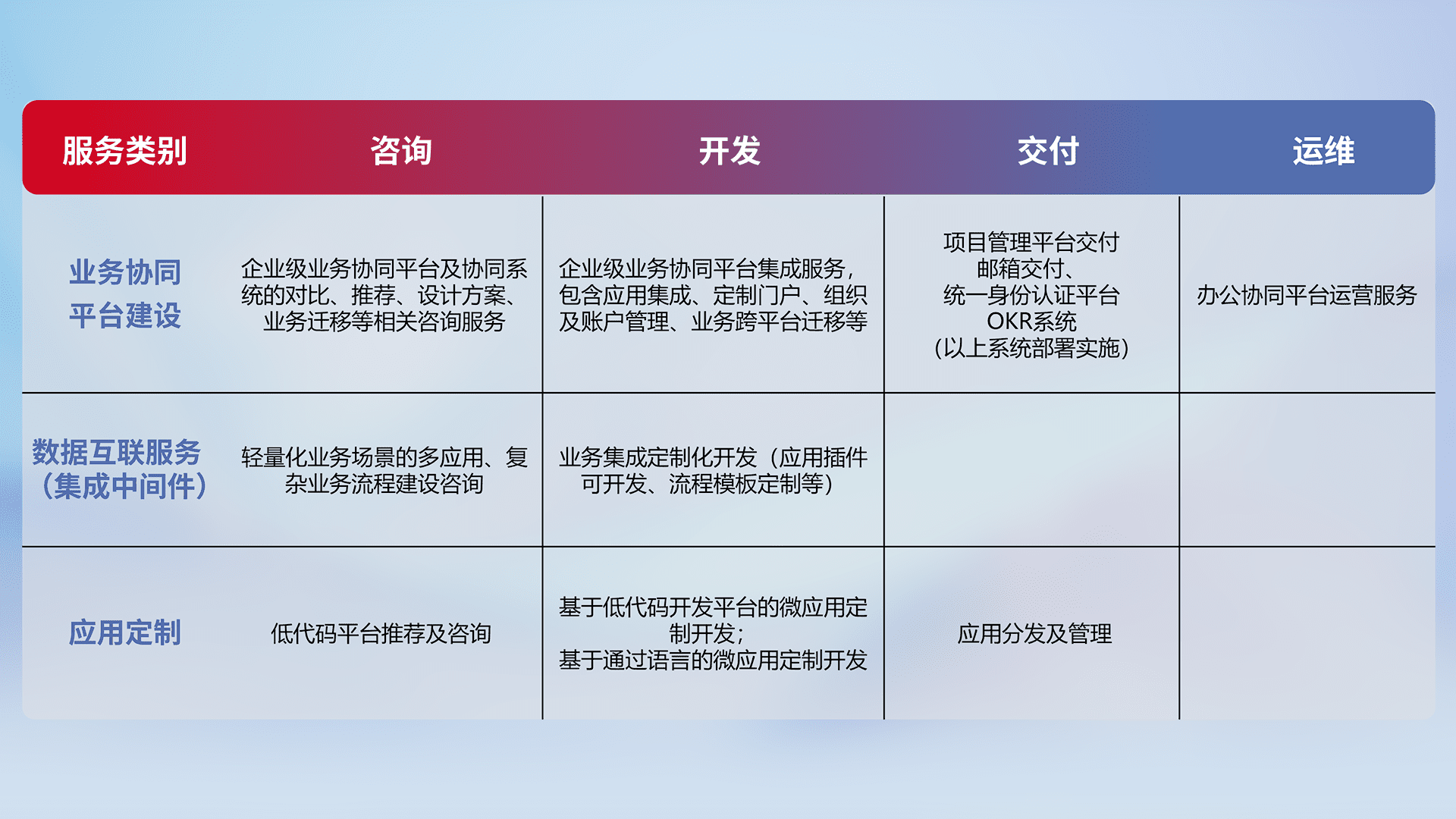 针对钉钉、、、企微、、、IDaas等平台级产品提供产品的规划、、、、方案、、、、交付、、、、定制化开发等服务,,,实现如统一协同办公、、、、智能客户服务、、、混合会议管理、、、、智能数据查询、、、等业务场景,,,,实现数字化转型。。。。