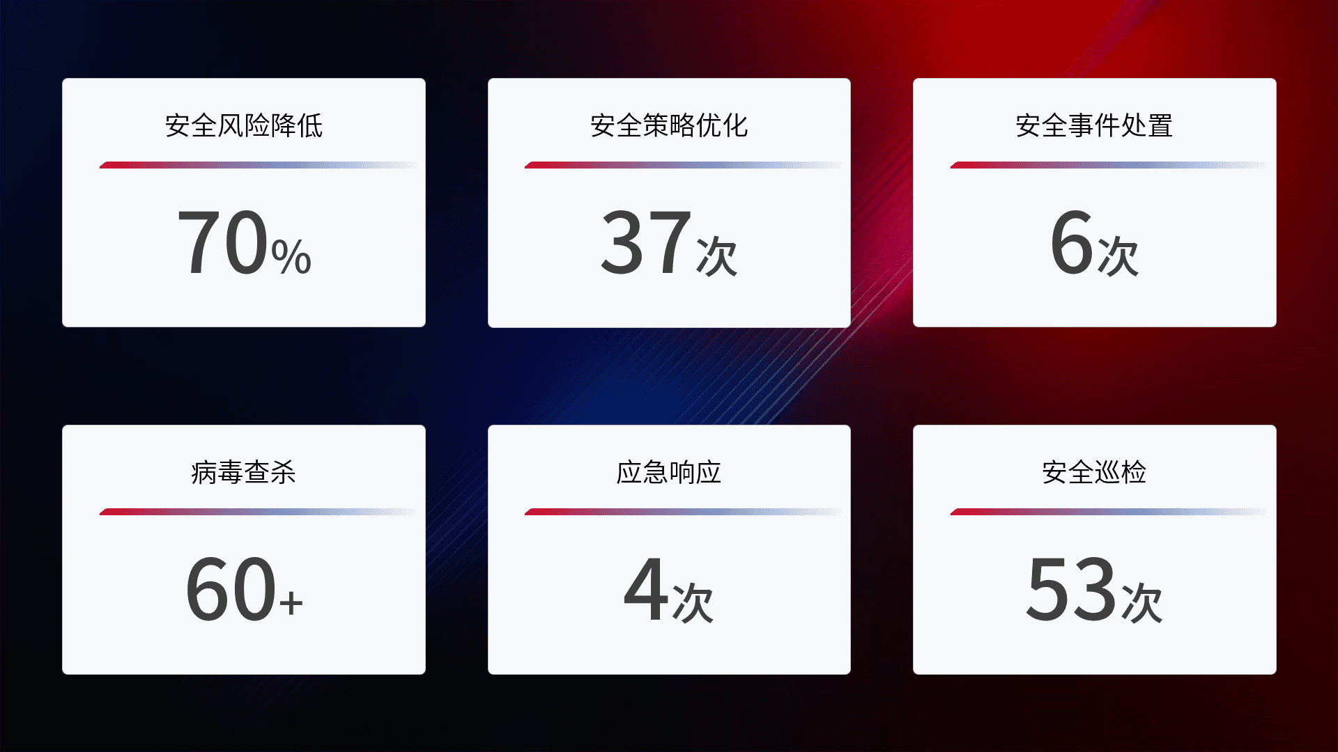 提供全面的安全事件报告体系,,,,包括处置报告、、周报、、、季度和年度总结,,,,结合持续监控,,,,帮助客户深入了解网络安全状况。。。