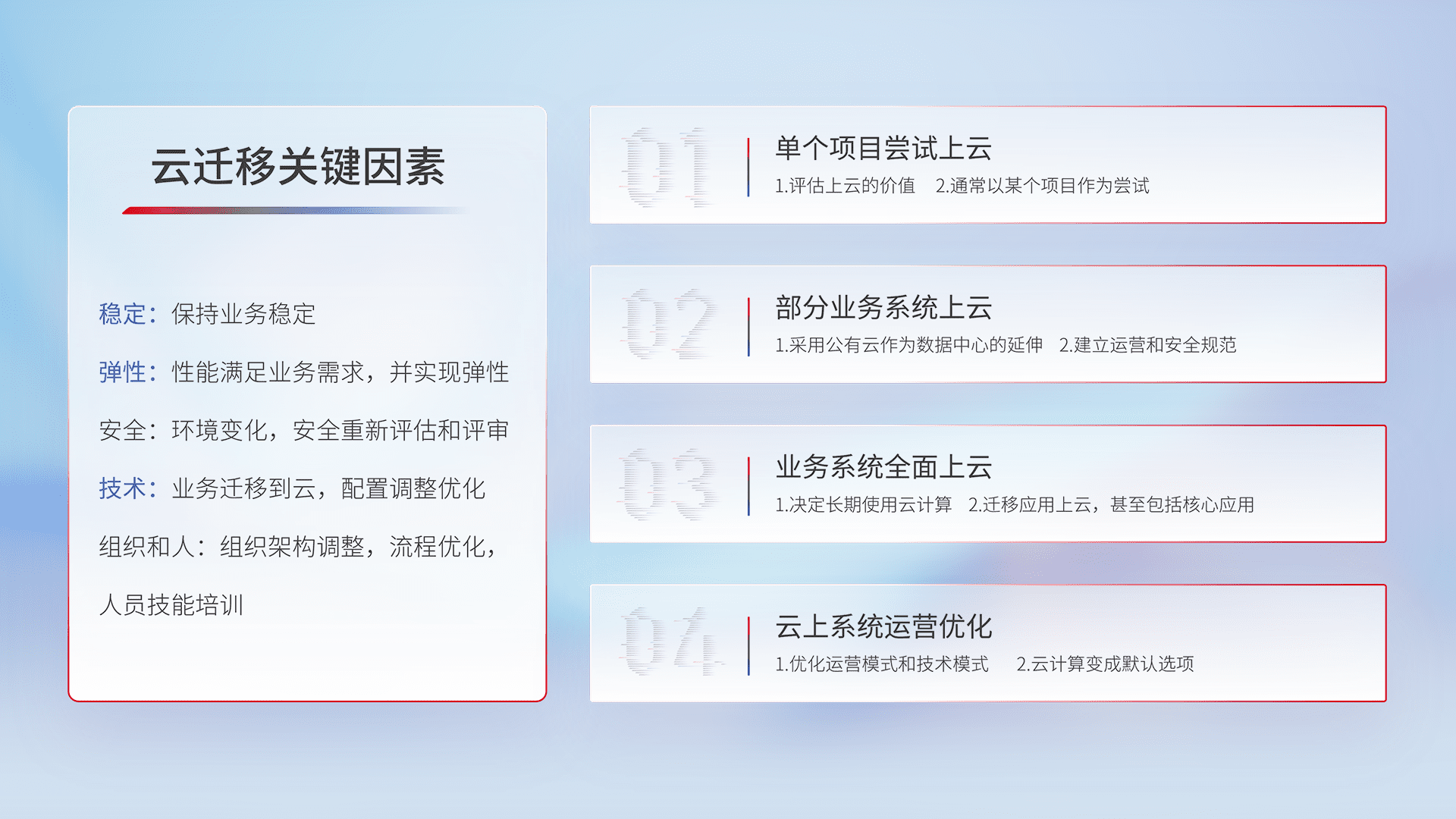 结合实际业务,,,从规划设计、、、、云平台选型、、、云原生改造、、、、数据迁移、、、集成交付,,迁移全过程为客户识别最佳上云路径,,,做好风险识别管理,,,,设计网络架构、、身份权限、、、、安全审计合规、、操作审计、、、日志审计、、、、监控告警策略、、多站点容灾设计等,,,,对云上基础设施进行整体规划,,,提升IT治理水平,,,,以满足弹性、、、、高可用、、高性能的需求。。。。