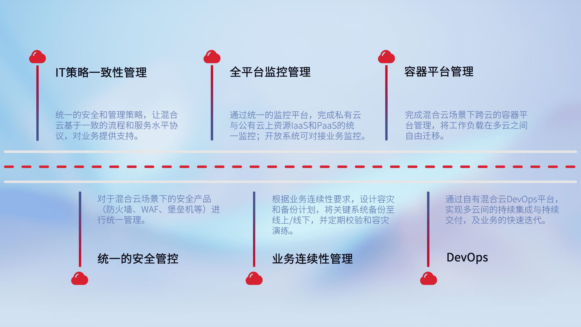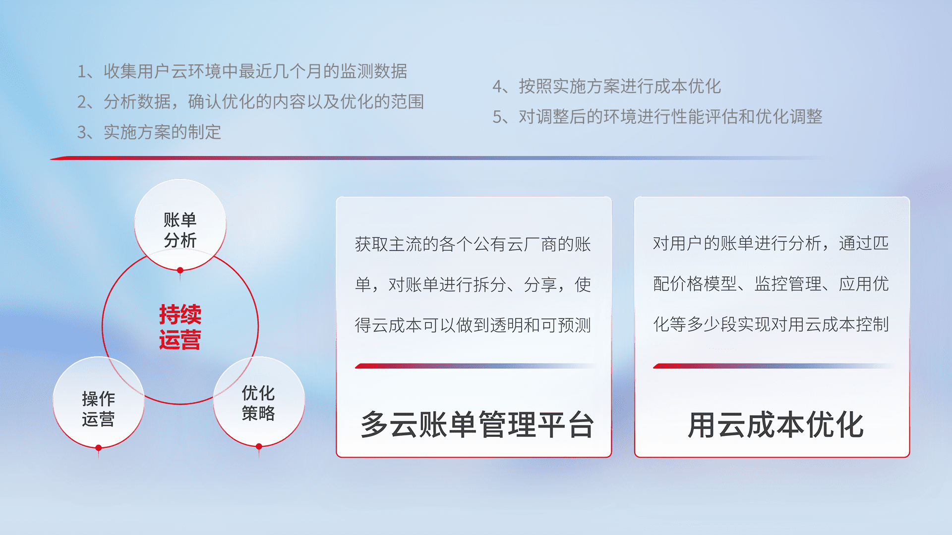 通过多云纳管,,,,以统一的资源数据模型把客户的云资源进行抽象和封装,,进而实现对多云资源的统一操作,,,保障云资源管理的可靠性、、、、稳定性与可用性。。。。量身定制化运维内容,,,,配置、、、、开发运维、、、补丁管理、、、、备份、、、监控、、认证和访问管理、、审计和日常巡检等,,保障在用云过程中的可靠度,,稳定度以及高可用率。。。